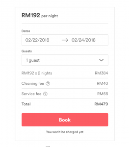 Selepas anda sudah decide untuk pilih property yang mana untuk menginap, anda boleh lihat berapa harga untuk keseluruhannya. Kebiasaannya, Airbnb mempunyai cleaning fee dan service fee tetapi ia tidak tinggi. Dan semasa anda booking, anda sudah boleh menggunakan credit $40 untuk tempahan anda yang pertama.