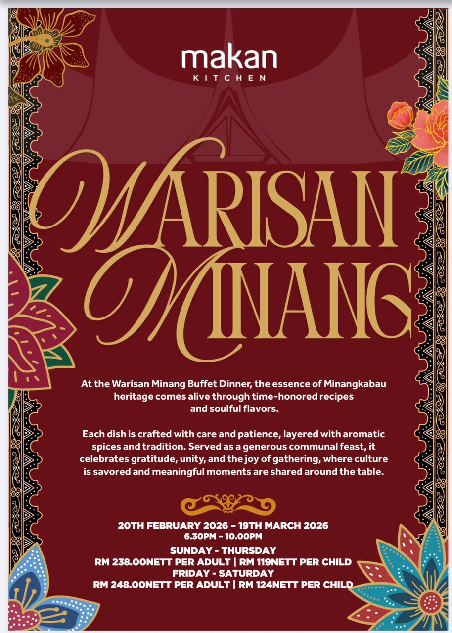 Tema Warisan Minang menjadi identiti utama buffet Ramadan ini. Ia menampilkan masakan berempah yang kaya rasa, diinspirasikan daripada tradisi Minangkabau serta cita rasa Nusantara.