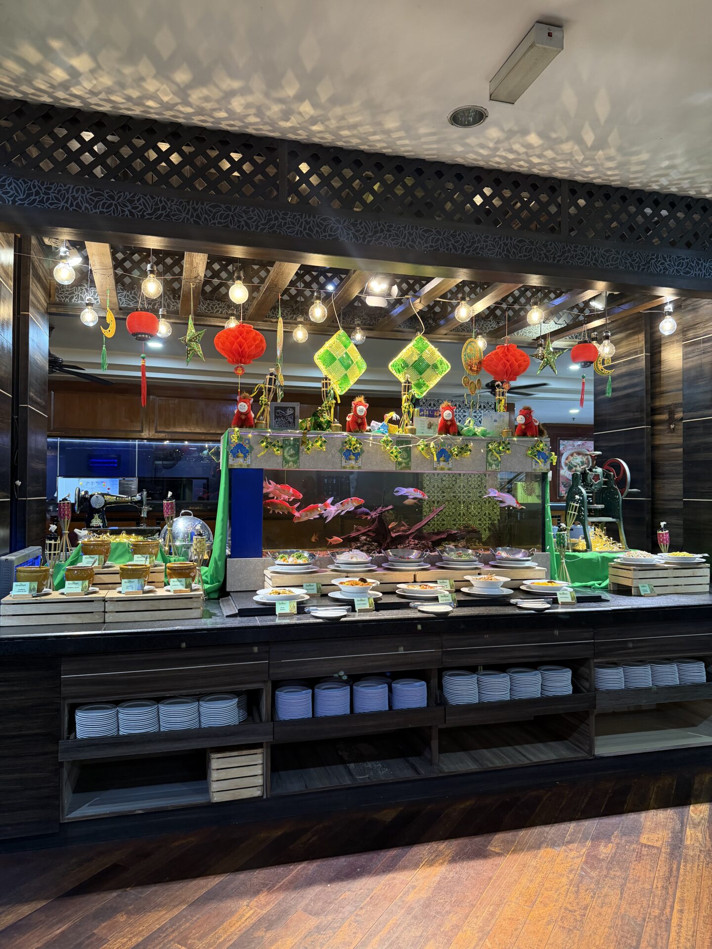 Suasana dewan makan sangat selesa dan mesra keluarga. Susun atur buffet tersusun rapi, memudahkan tetamu bergerak tanpa bersesak. Staf juga mesra dan cekap memastikan makanan sentiasa ditambah.